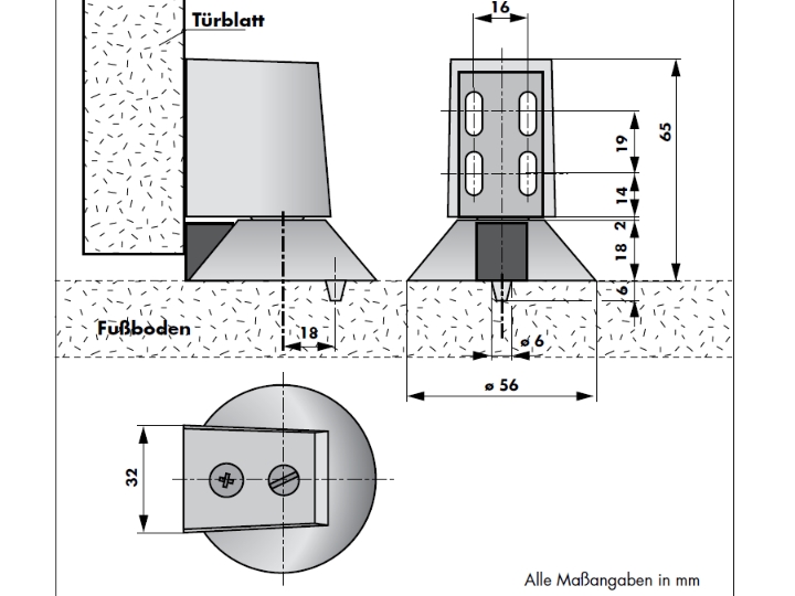 - Nun wird die Tür bis zur gewünschten Position geöffnet und der Teller des DICTATOR Kugelfeststellers mit der mitgelieferten Senkkopfschraube (M8x50) dort am Boden befestigt (zunächst mitgelieferten Dübel setzen!).