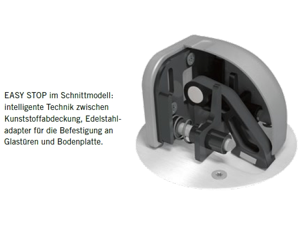 Mit dem neuen DORMA EASY STOP wird die Tür im flächenbündig eingelassenen Bodenteller sanft gestoppt. Das zu weite Öffnen der Tür oder ein abruptes Stoppen wird verhindert.