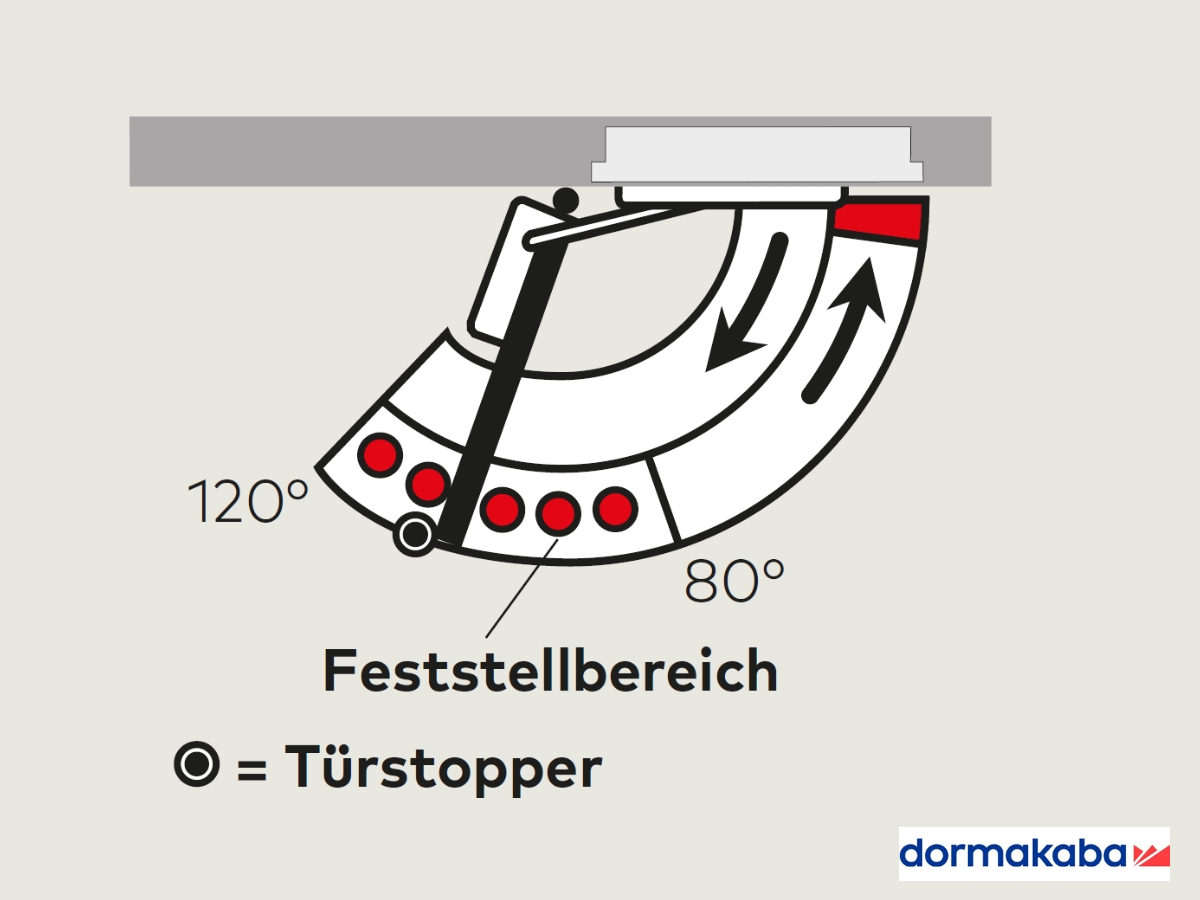 Der Feststellpunkt ist auf einen Öffnungswinkel zwischen ca. 80° und 120° einstellbar. Der Feststellpunkt ist gleichzeitig der max. Türöffnungswinkel, Tür-stopper setzen.