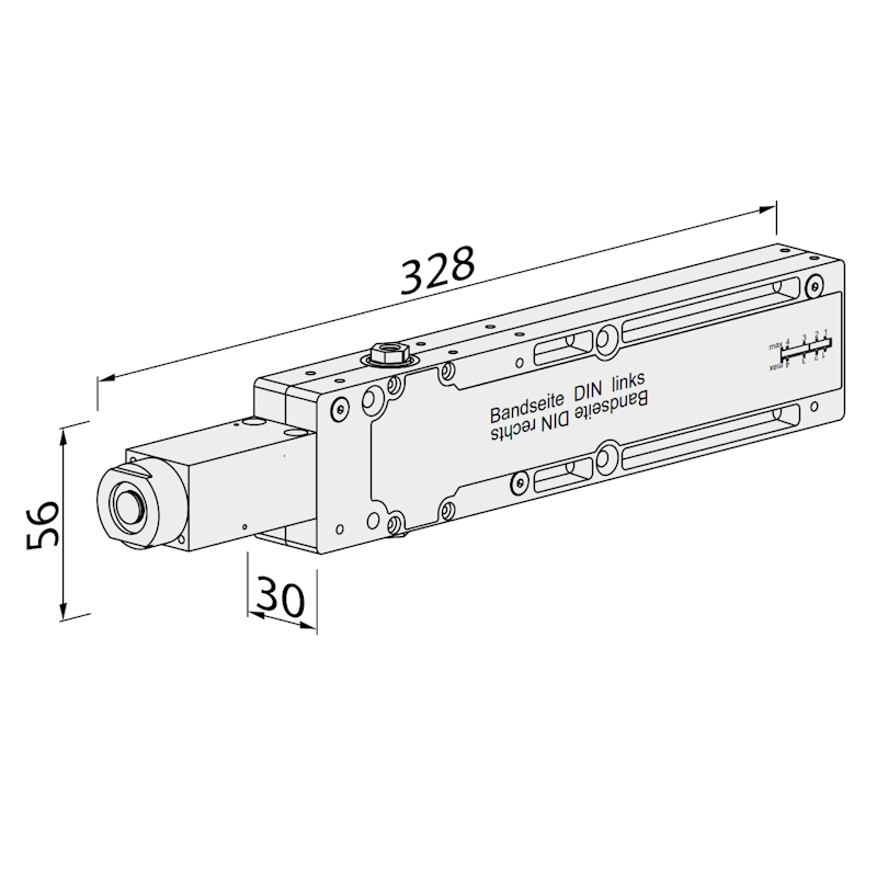 - Die Schließkraft (EN 2-4) sowie die Schließgeschwindigkeit und der Endschlag sind bequem über Ventile von oben im Falzbereich justierbar, ohne dass der Schließer ausgebaut werden muss.
