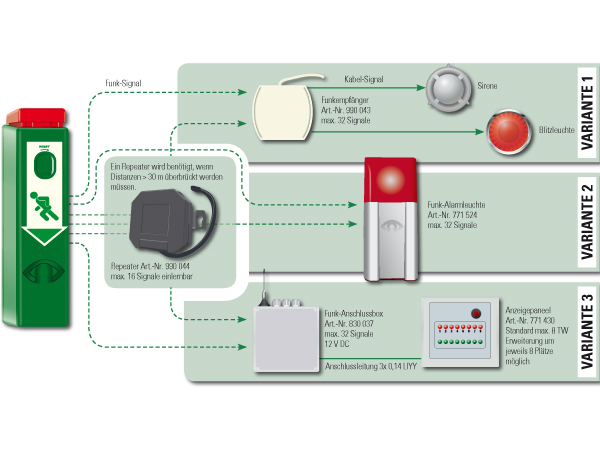 - Dauerhafter Hauptalarm wird erst bei vollständigem Durchdrücken der Klinke umgesetzt. Bei beim Herunterdrücken der Türklinke wird ein Signal gesandt. Das gesendete Funksignal kann empfangen werden entweder von einem Funkempfänger, (GfS-Art.-Nr. 990 043) von der Funk-Alarmleuchte (GfS-Art.-Nr. 771 524) bzw. von der Funk-Anschluss-Box (GfS-Art.-Nr. 830 007). Ein Funkrepeater (GfS-Art.-Nr. 990 044) kann das Signal ebenfalls empfangen und wird zur Erweiterung der Empfangsweite um weitere 30 m eingesetzt.
