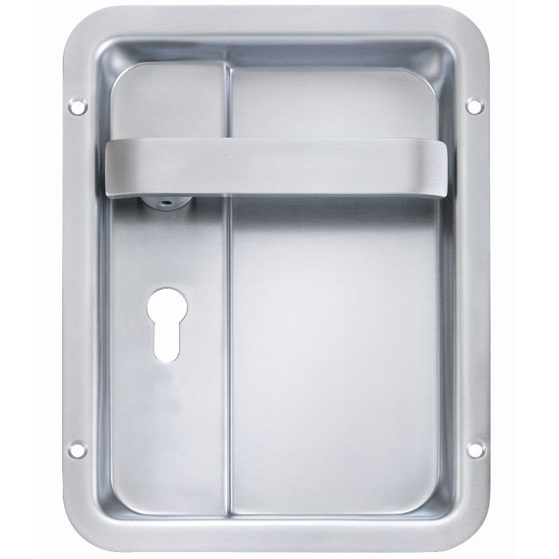 Muschelgriff aus Edelstahl matt gebürstet mit einliegendem, fest drehbarem Drücker. Der Stift des Stiftteils ist verschraubt. Dieser Griff wird z.B. in Turnhallen, Wohnwägen und an Türen eingesetzt bei denen nichts hervorstehen darf.