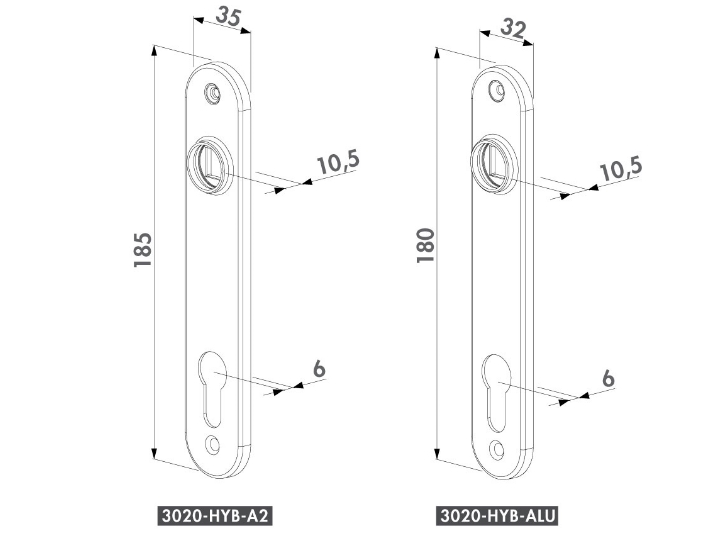 Langschild 3020-HYB passend zu den Schlosstypen H-Metal, H-Metal WB und H-Wood, Entfernung 92 mm. Verfügbar in Edelstahl oder anodisiertem Aluminium. Schrauben einbegriffen.