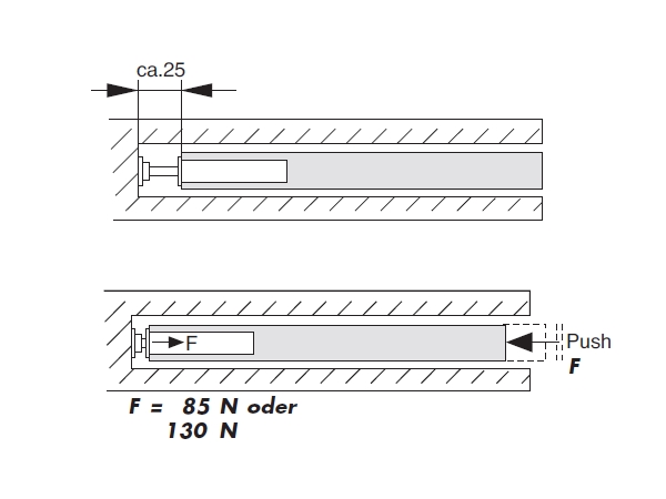 Die Tür kann komplett geöffnet werden, sie verschwindet in der Wandnische und wird dort durch den Rückstellpuffer festgehalten. Soll die Tür wieder geschlossen werden, genügt ein leichter Druck gegen die Türkante. Die Kolbenstange des Rückstellpuffers wird eingeschoben und die eingebaute Feder stößt die Tür mit einer Kraft von maximal 85 N/130 N aus der Wandtasche heraus, so daß der Türgriff zugänglich wird.